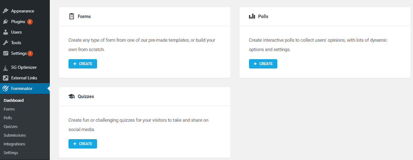 Getting to the quiz creating section can also be done in two ways. The first way is by hovering your mouse over the Forminator tab and then clicking on the “Quizzes” option. The second way is by clicking on the Forminator tab. This will land you on the Forminator dashboard, which consists of three important modules: the form creating module, poll creating module, and the quiz creating module. The last one, of course, is the one we will be focusing on.
